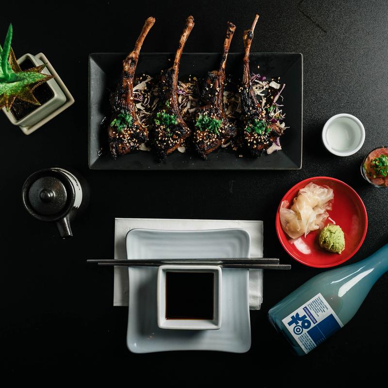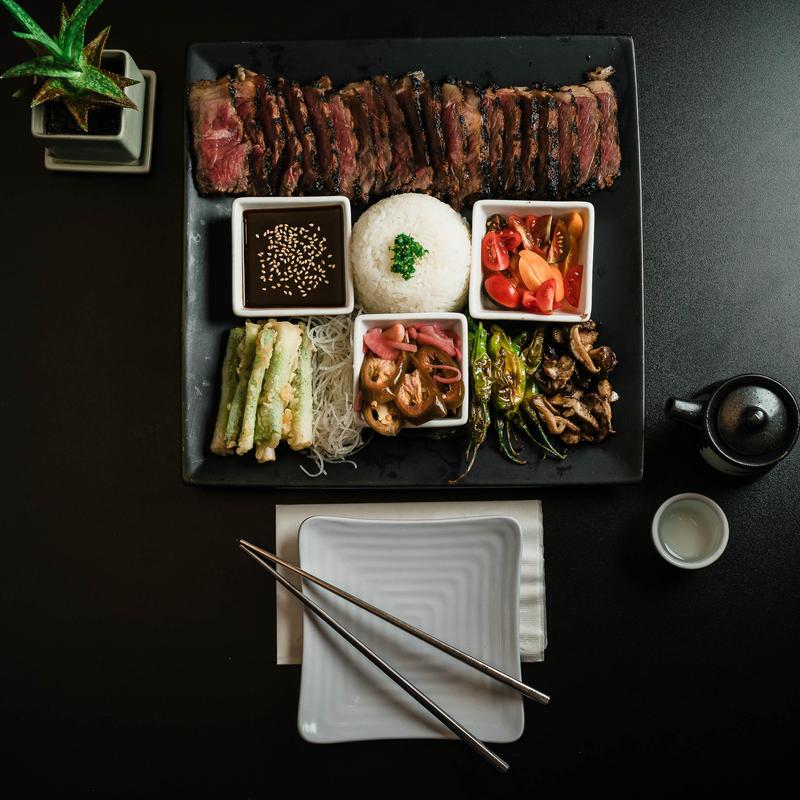 Our miso-sake marinated grass-fed 14oz New York strip-loin, is cooked to medium-rare perfection and served tataki style with house-made Japanese BBQ sauce. Served with seasonal vegetables and white rice.