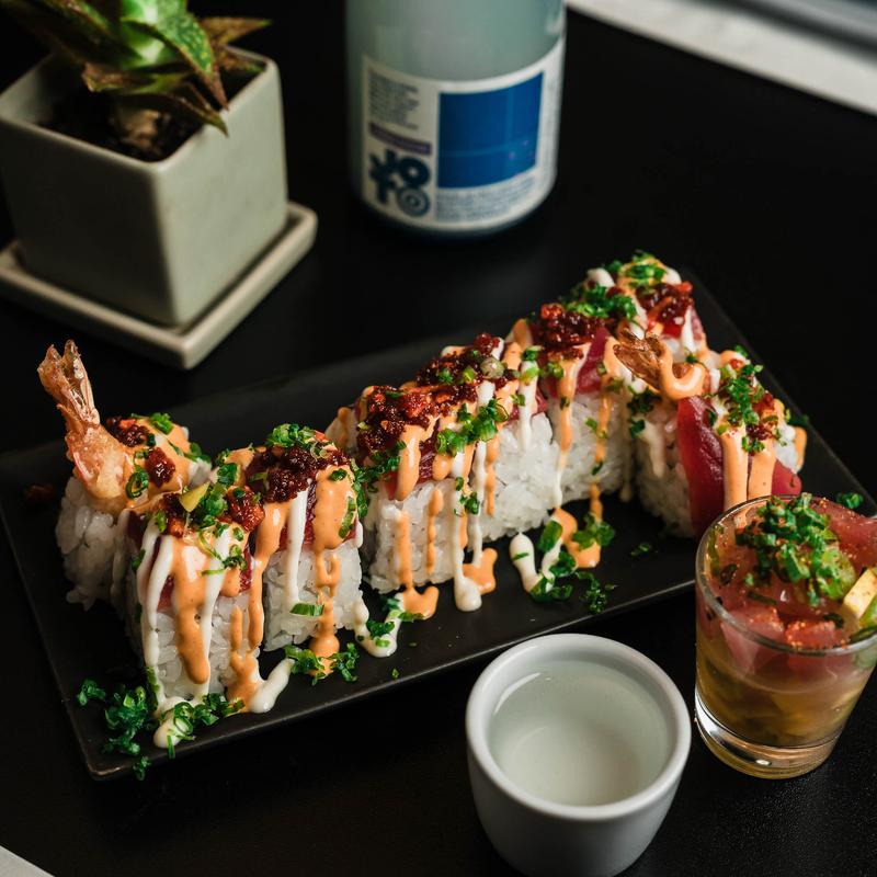 Tempura shrimp, cream cheese and mango topped with avocado, tuna, tobiko, ninja sauce and mango sauce.