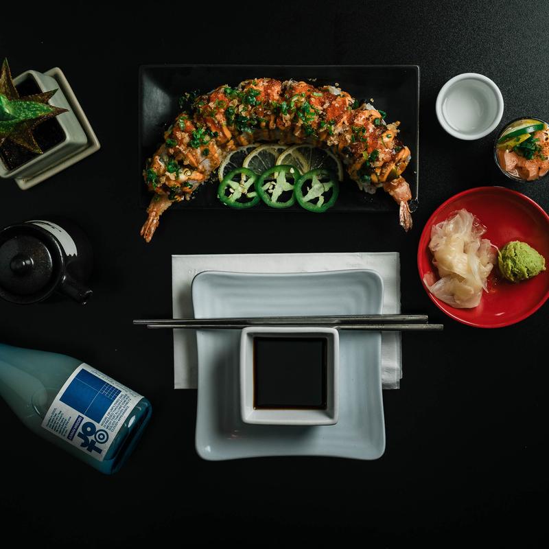 Tempura shrimp and tuna topped with avocado, scallop, lemon, samurai sauce, and geisha sauce.