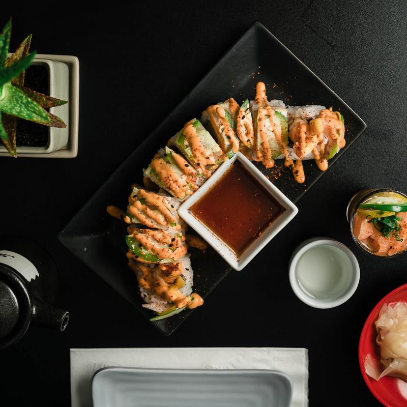 Marinated tofu, marinated mushrooms, and cucumber topped with avocado, lemon, jalapeno, green onions, 7 spices, spicy ponzu, geisha sauce, and samurai sauce.