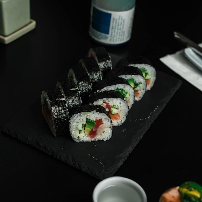 Salmon, cucumber, and avocado topped with tuna, hamachi, and tobiko.